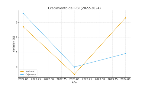 En Cajamarca, la economía creció 3,6% en 2022 gracias al dinamismo de servicios y construcción, aunque la minería cayó -0,3% y la agricultura -1,0% (BCRP – Sucursal Trujillo, 2023). Sin embargo, en 2023 el departamento se estancó y para 2024 se proyecta apenas 0,9% de crecimiento (Gestión, 2024), proyectandose a 2025 un ~0.9 .